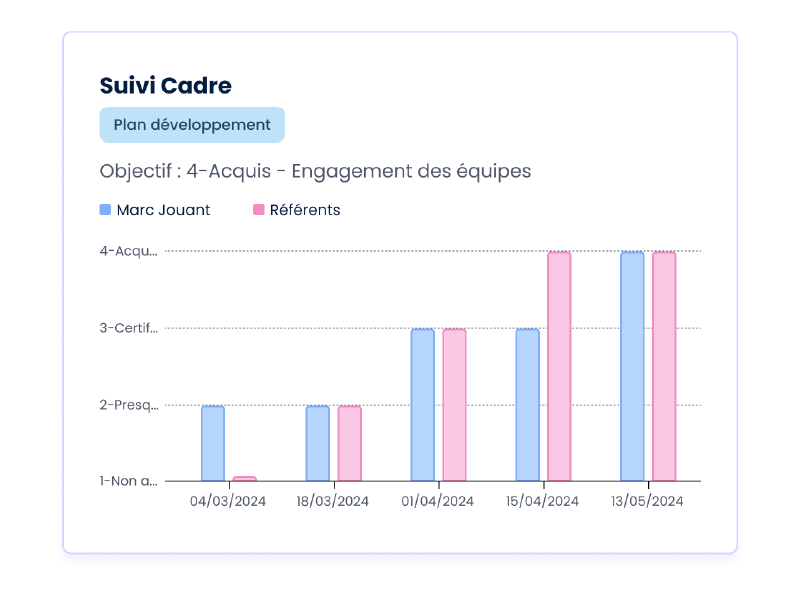 Dynamisez le développement de vos équipes grâce à des retours réguliers, constructifs et ancrés dans le quotidien. La solution facilite la mise en place d’échanges continus et utiles, offrant à chaque collaborateur la possibilité d’identifier ses forces, d’agir sur ses axes de progression et de s’impliquer activement dans son évolution professionnelle.